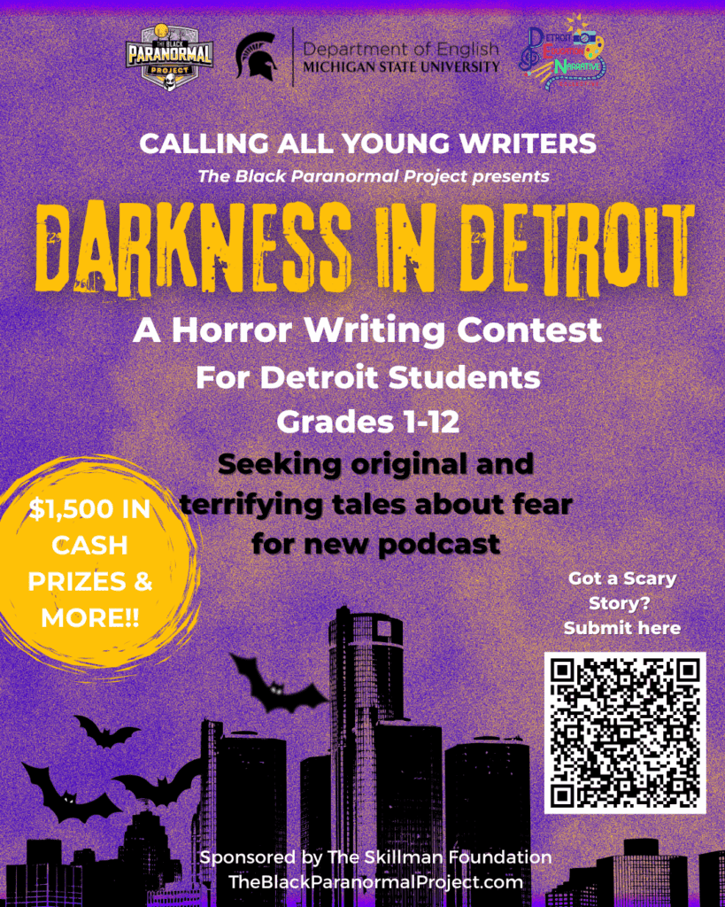 Darkness in Detroit, a scary story competition and podcast series, puts a spotlight on the rising literary talent of Detroit’s youth. The project began with a citywide writing contest for Detroit K-12 students, inviting them to write original horror stories rooted in their personal fears and how they dream of overcoming them. Winning stories were produced into audio pieces and included interviews with the young writers to explore their creative processes.