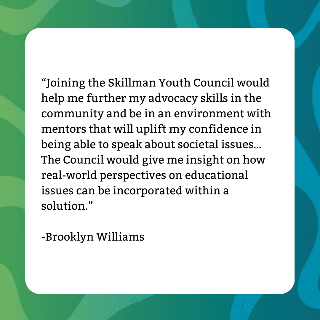 Brooklyn Williams is an 11th grade student at Cass Technical High School. She is involved in six extracurricular activities including DECA Inc., Winning Futures, Rotary Interact Club, Pretty Brown Girls, Cass Tech Great Girls, and Detroit Windsor Dance Academy Teen Mentors. Brooklyn joined the Skillman Youth Council because of her passion for public education. She feels education is the key to unlock doors to generational success in her community, fueling her drive for her higher education. She wants to support those around her to be wealthy in knowledge by advocating for access to educational resources.